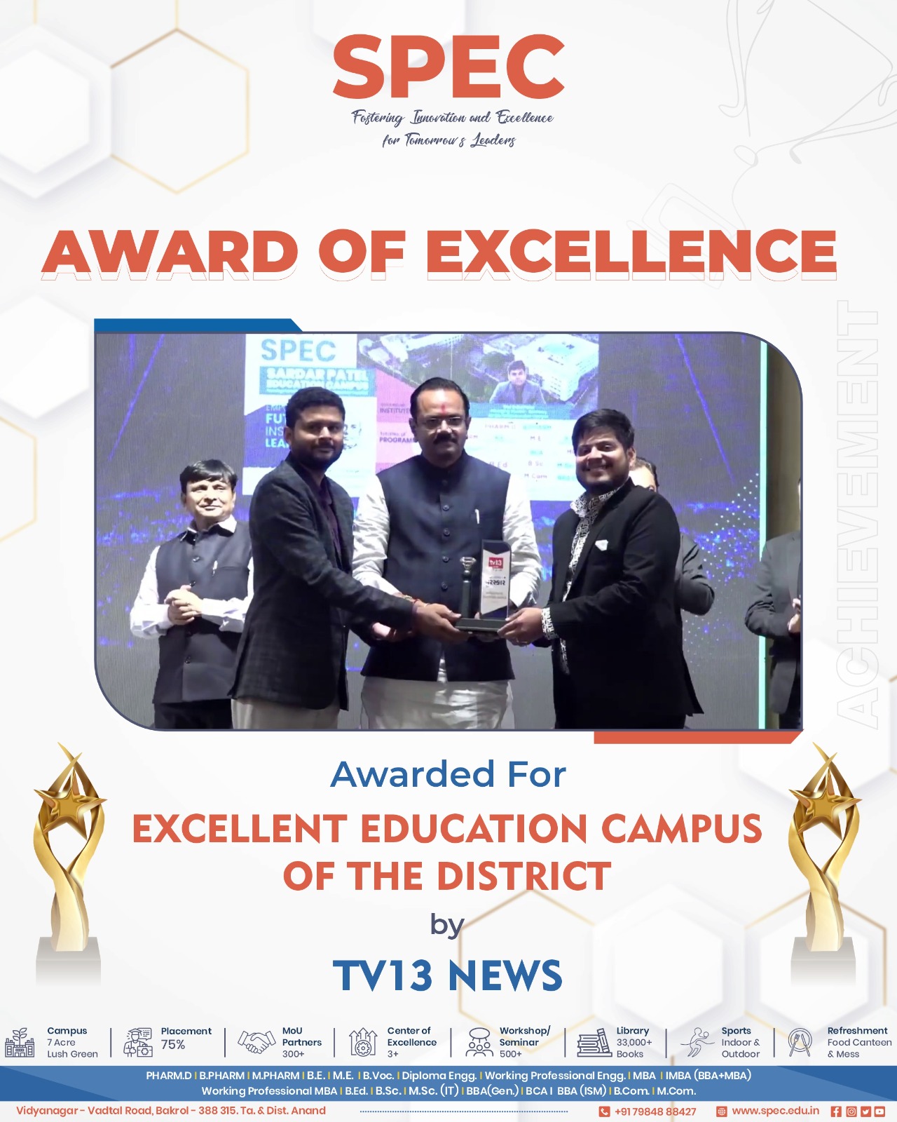 SPEC's Sardar Patel College of Administration and Management (MBA) being Awarded as the Best MBA College in Gujarat by VTV News under Drona Awards 3.0