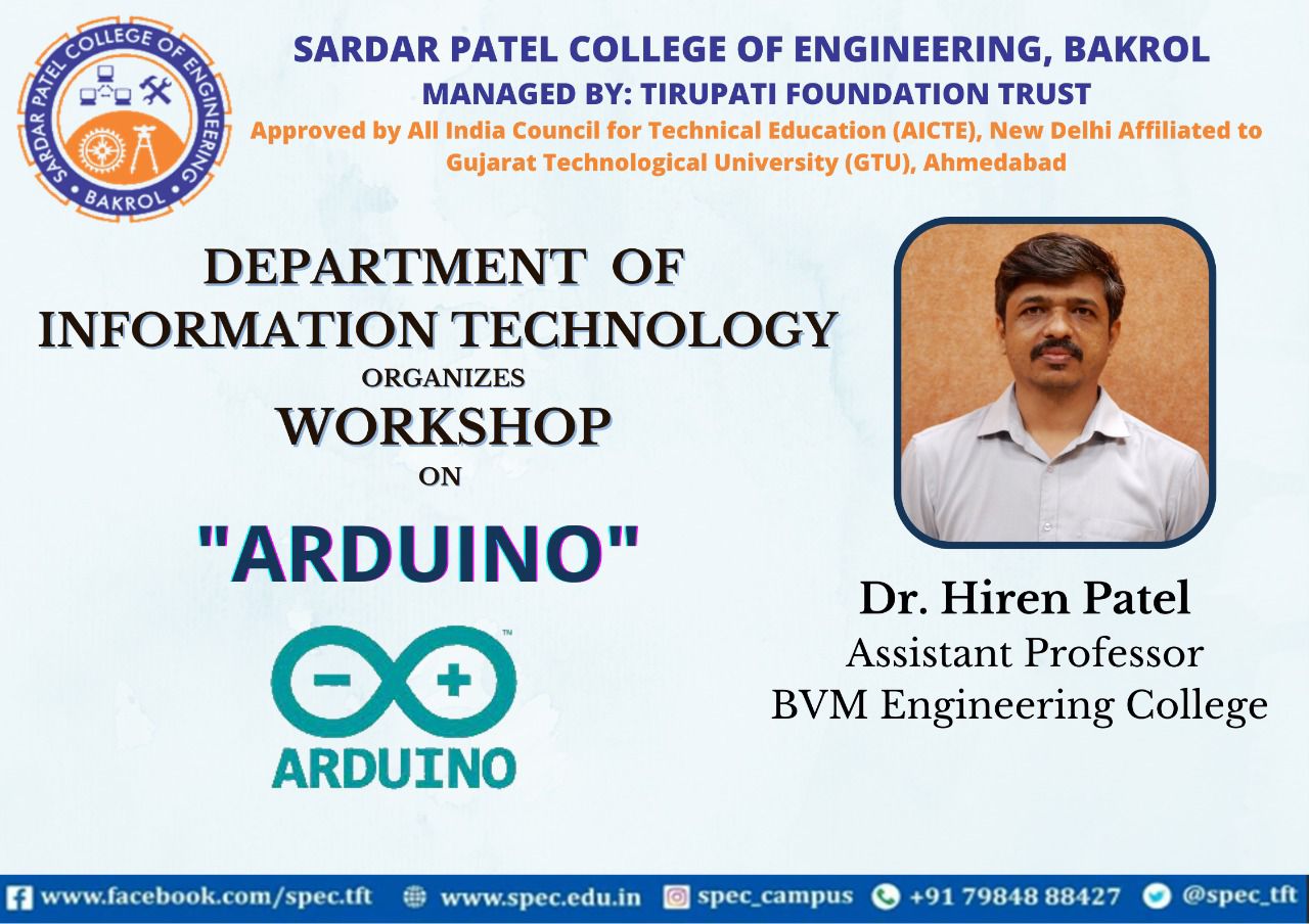 It is an immense pleasure to inform you that *Department of INFORMATION TECHNOLOGY* from Sardar Patel College of Engineering is going to arrange a *Workshop* on *Arduino* dated on *29th July 2022, 10:30 AM* onwards for CE/IT students.