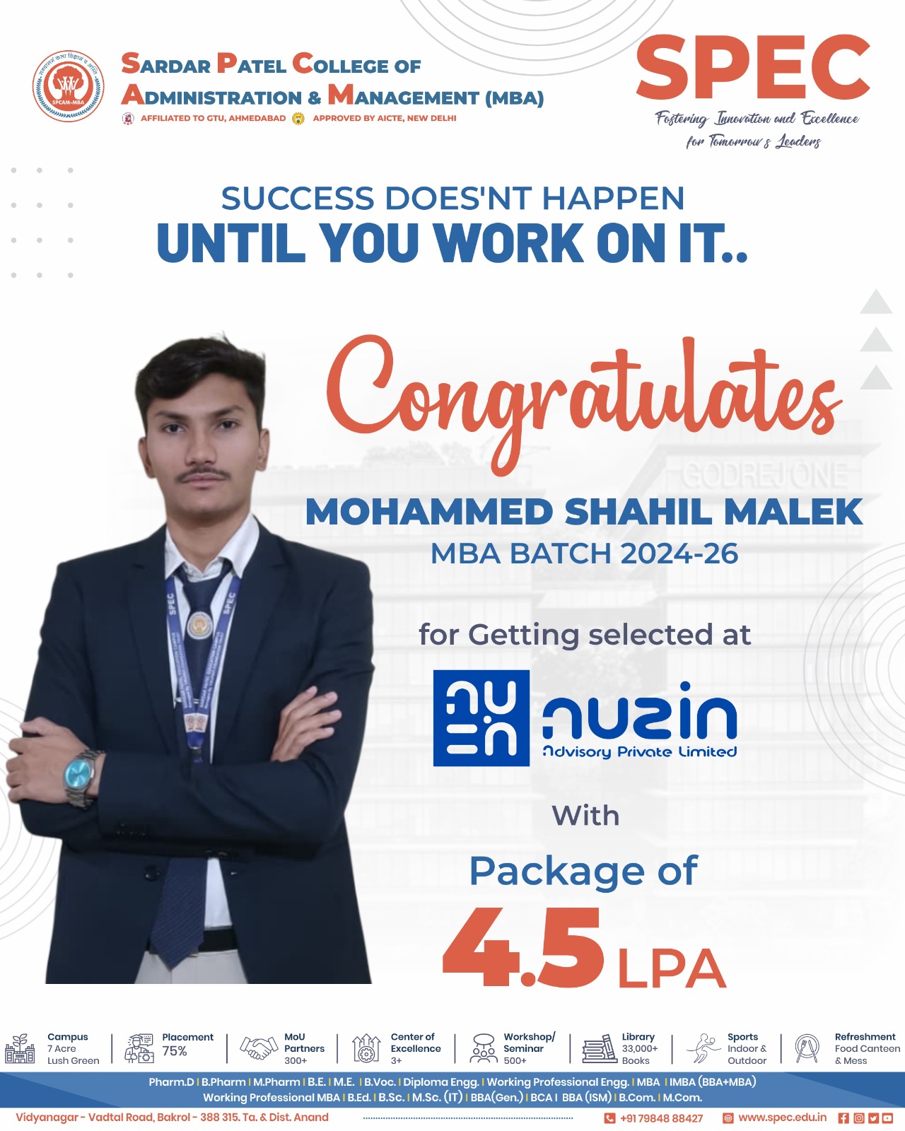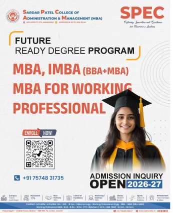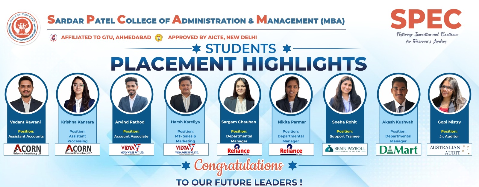SPCAM-MBA established in 2009 & one of the finest management Institution in Gujarat having well-conceived, defined and synchronized delivery system, this Success is realized through an efficient and optimum combination of management of discrete and scattered resources vis-à-vis HR, Infrastructure, Lab and Equipments, Industrial Exposure and Training, Continuous Evaluation, Project Works and Seminars, Placements, Utilization of the latest Teaching Aids and other Concurrent supporting resources available in the field today.